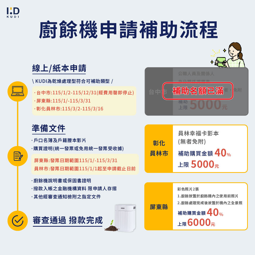 KUDI 全能淨透廚餘機符合政府「乾燥處理型」補助規範機型。